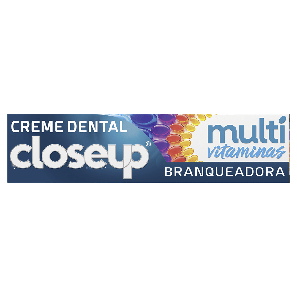Closeup Multivitaminas +12 Beneficios Branqueador, que garante até 18 horas ininterruptas de ação & proteção completa na boca. Ele possui fórmula enriquecida com uma mistura de vitamina C, vitamina E, mineral de zinco e flúor para cuidar de suas necessidades de higiene bucal. Este creme dental é a escolha perfeita, pois possui os 12 beneficios mais importantes para um cuidado completo: proteção contra bactérias, mau hálito, dentes amarelados, erosão do esmalte, ataque ácido, manchas, cáries na raiz, cuidado das gengivas, sensibilidade, tártaro e placa.