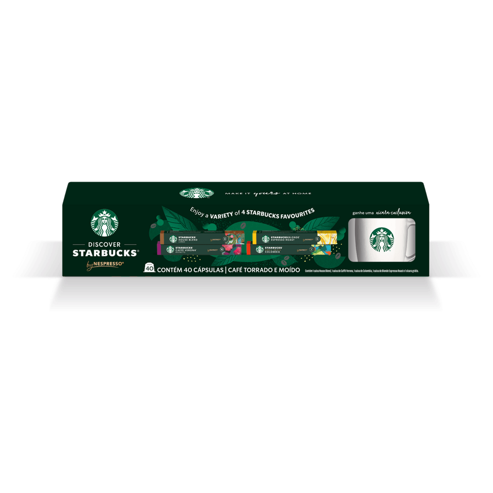 Desfrute do Kit Café em Cápsula Starbucks com 10 unidades de cada blend: House Blend, Verona, Colombia e Blonde Espresso Roast. Variedade e qualidade para diferentes momentos do seu dia, com o sabor exclusivo Starbucks em cada xícara. Ideal para quem aprecia café fresco, prático e cheio de aroma. E tem mais: ganhe uma caneca exclusiva para tornar sua experiência ainda mais especial. Perfeito para presentear ou renovar seu estoque com estilo!