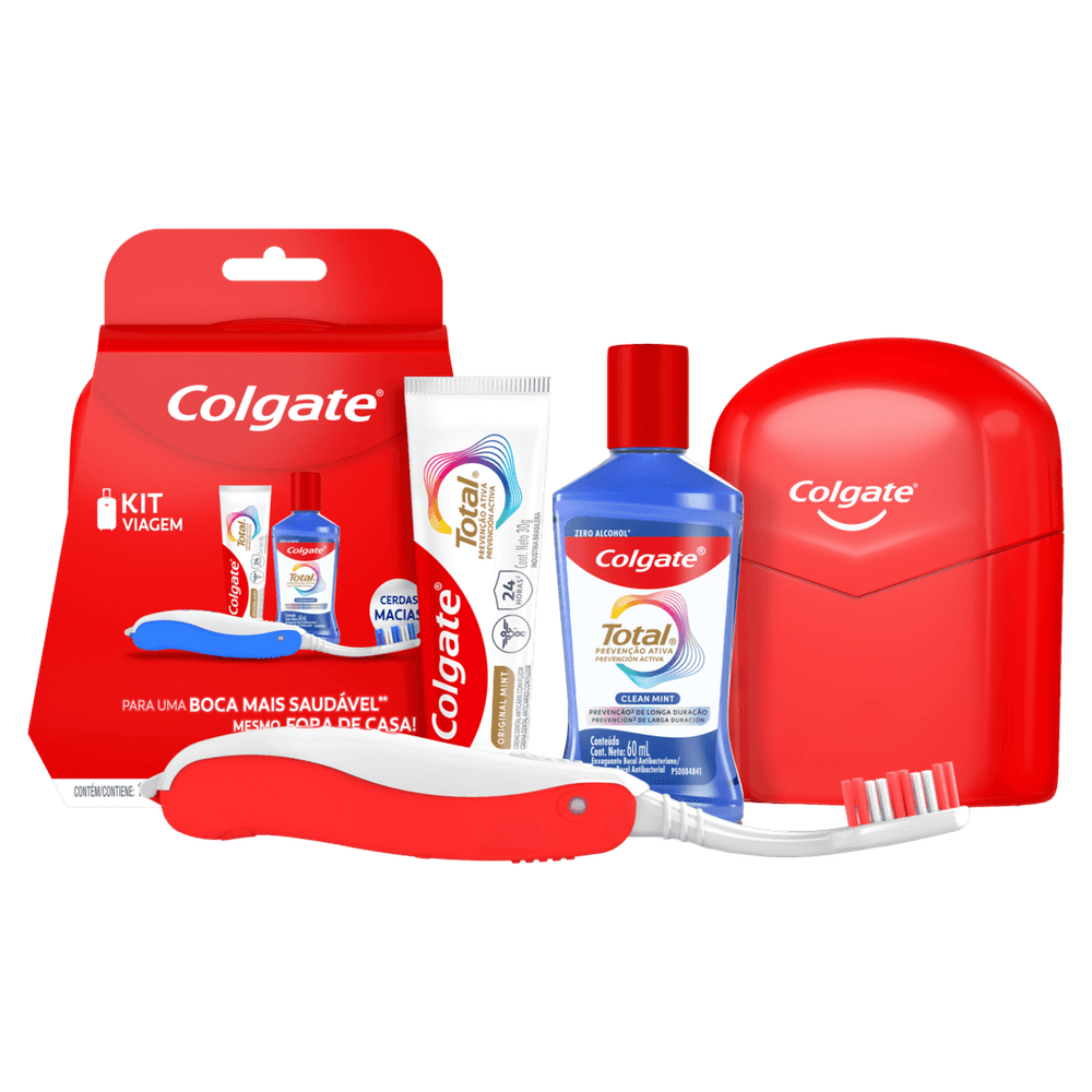 Conheça o Kit Completo Colgate Total Prevenção Ativa, com estojo prático para levar onde quiser. Ele inclui creme dental anticárie Original Mint 30g para proteção diária dos dentes, enxaguante bucal antibacteriano Clean Mint 60ml que elimina germes e deixa o hálito fresco, e escova dental macia com cabeça normal, perfeita para uma limpeza eficaz e confortável. Ideal para quem busca cuidado completo e praticidade em um só kit. Mantenha seu sorriso saudável e protegido com os produtos de confiança Colgate Total, garantindo frescor e higiene bucal o dia todo. Perfeito para uso diário ou para levar em viagens e no trabalho. Aproveite essa solução completa para sua saúde bucal!