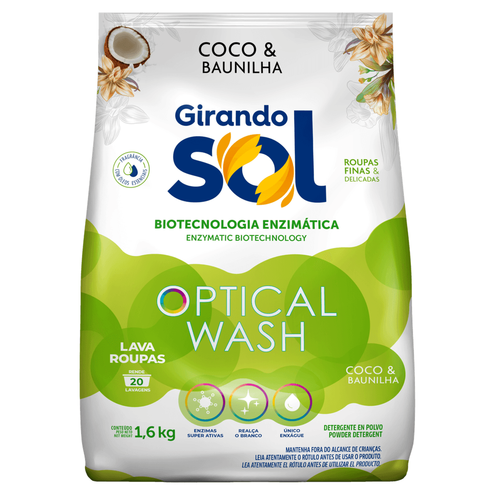 Lava Roupas em Pó Girando Sol Optical Wash Coco & Baunilha: combina a delicadeza do coco com a suavidade da baunilha para roupas limpas, perfumadas e com brilho realçado. Ideal para cuidar das suas peças com carinho e eficiência.